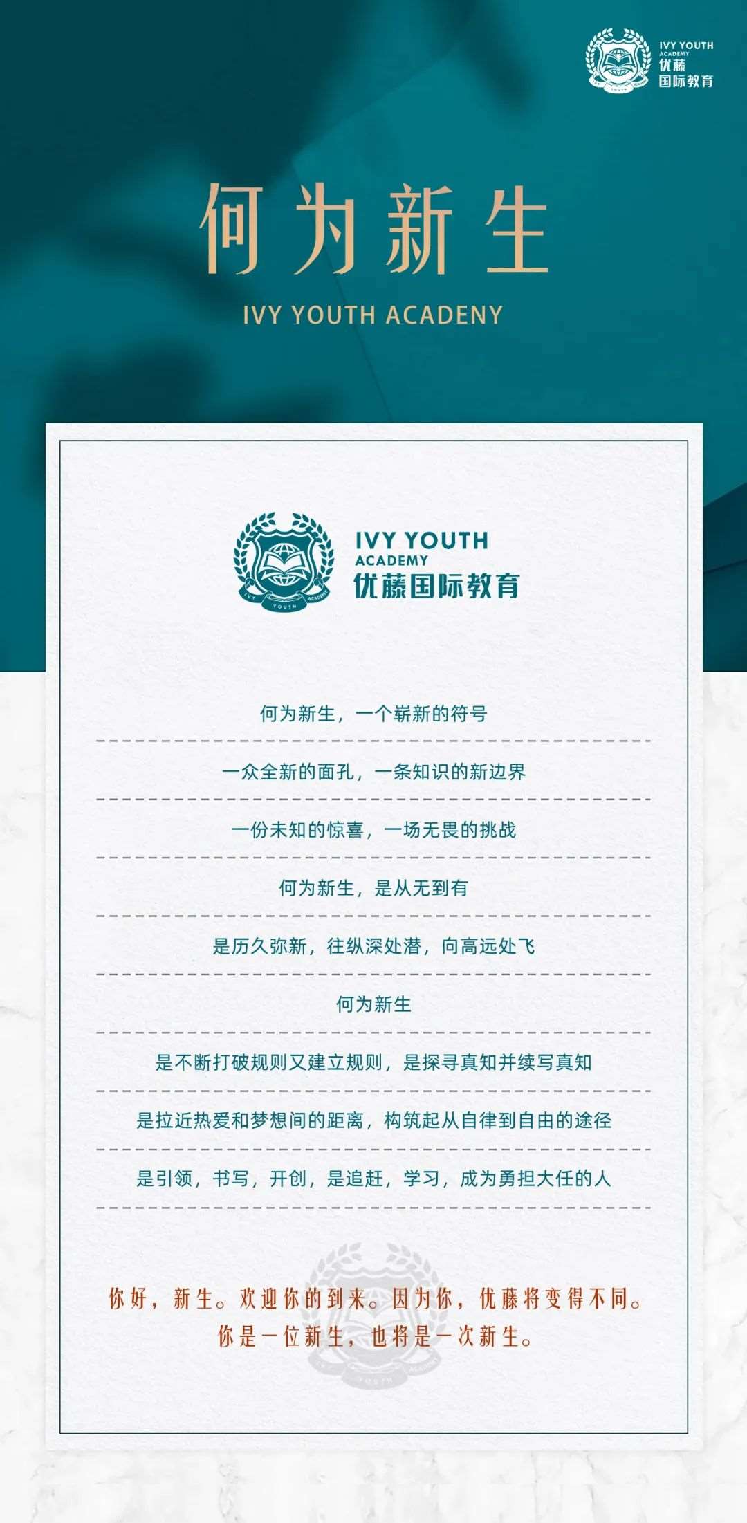 衷心祝愿你们在优藤度过一段快乐、充实、难忘的时光,成为有理想、有道德、有文化、有能力的新时代青年,再次欢迎你们加入优藤这个大家庭,让我们携手开启一段崭新的青春旅程,共同创造美好的未来!