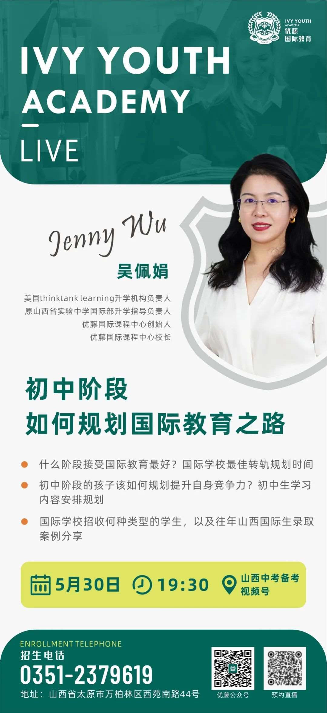 为此,优藤国际学校校长吴佩娟女士,特此开展线上讲座,为初中阶段想要了解、选择国际教育的家庭,讲述该阶段如何进行个性化的国际教育规划。