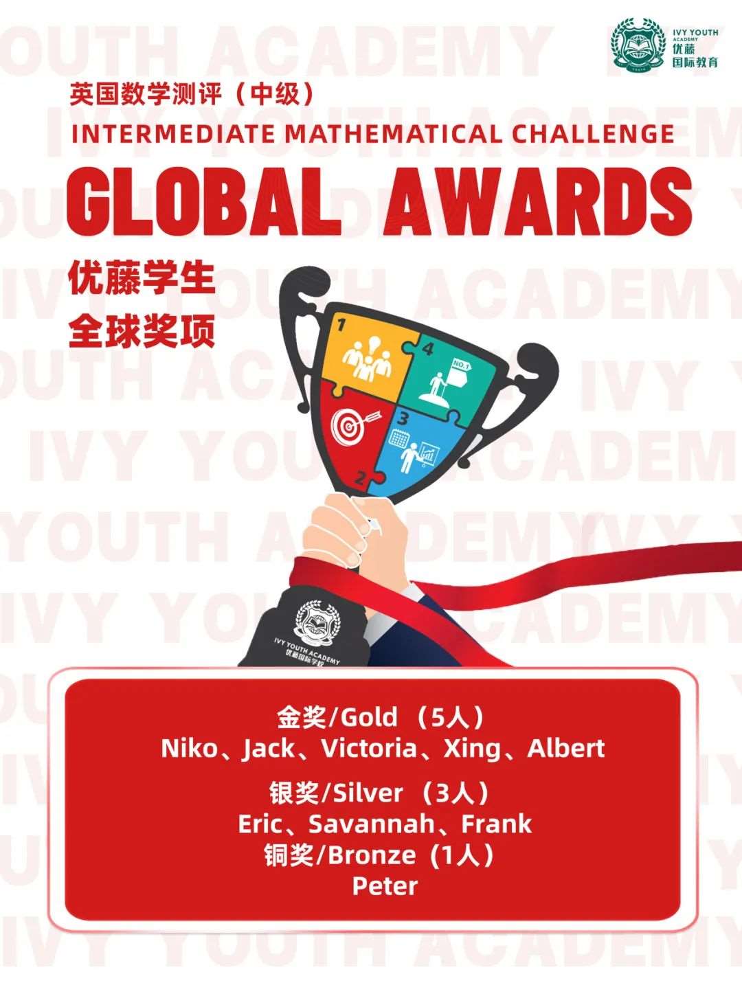 令人振奋的喜讯频频传入优藤校园。2024年2月1日,UKMT主办的 “英国数学测评(中级)(IMC)” 在线上进行,我校多名学生参与此次竞赛。近日,IMC数学竞赛结果放榜,我校同学在本次竞赛中取得了优异*。5名同学获得全球金奖(Global Gold Award)、3名同学获得全国银奖(Global Silver Award)、1名同学获得全国铜奖(Global Bronze Award)。