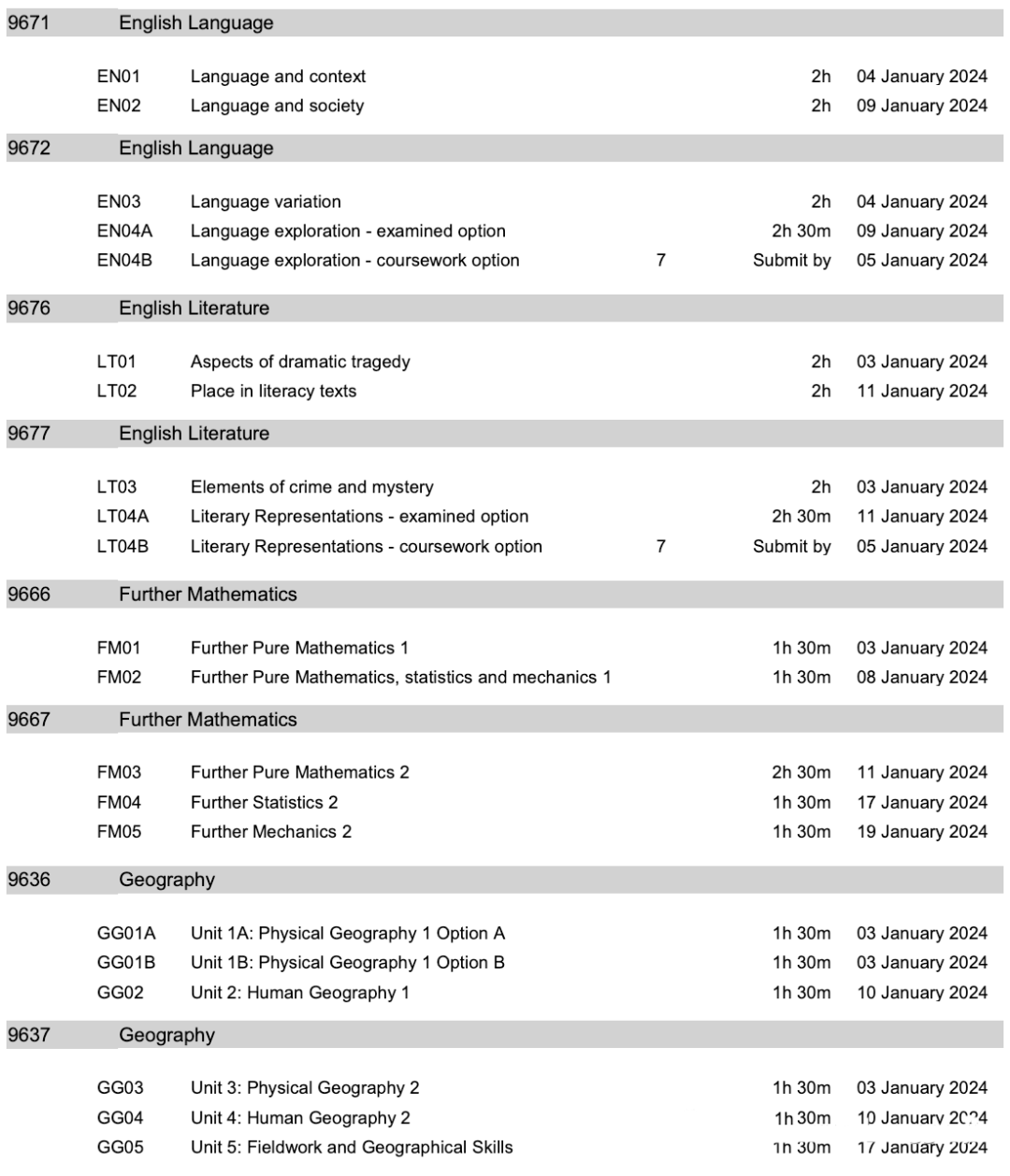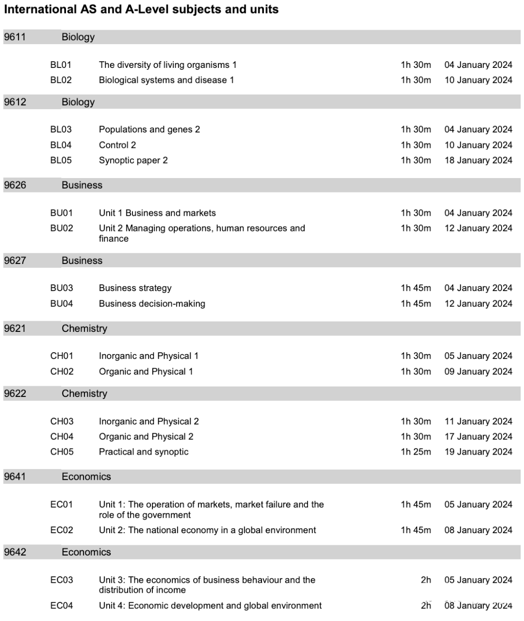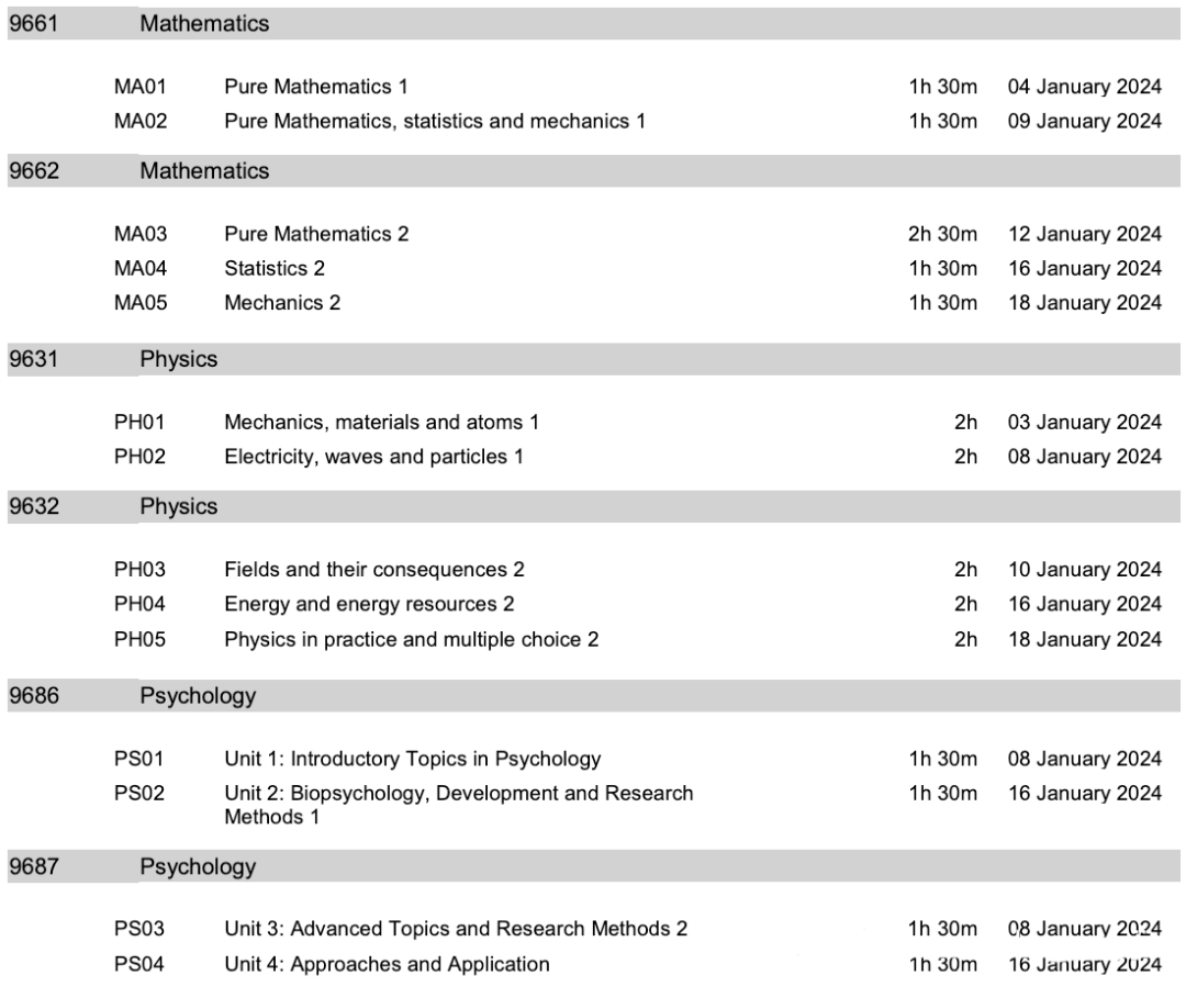 1月A-Level考试时间安排