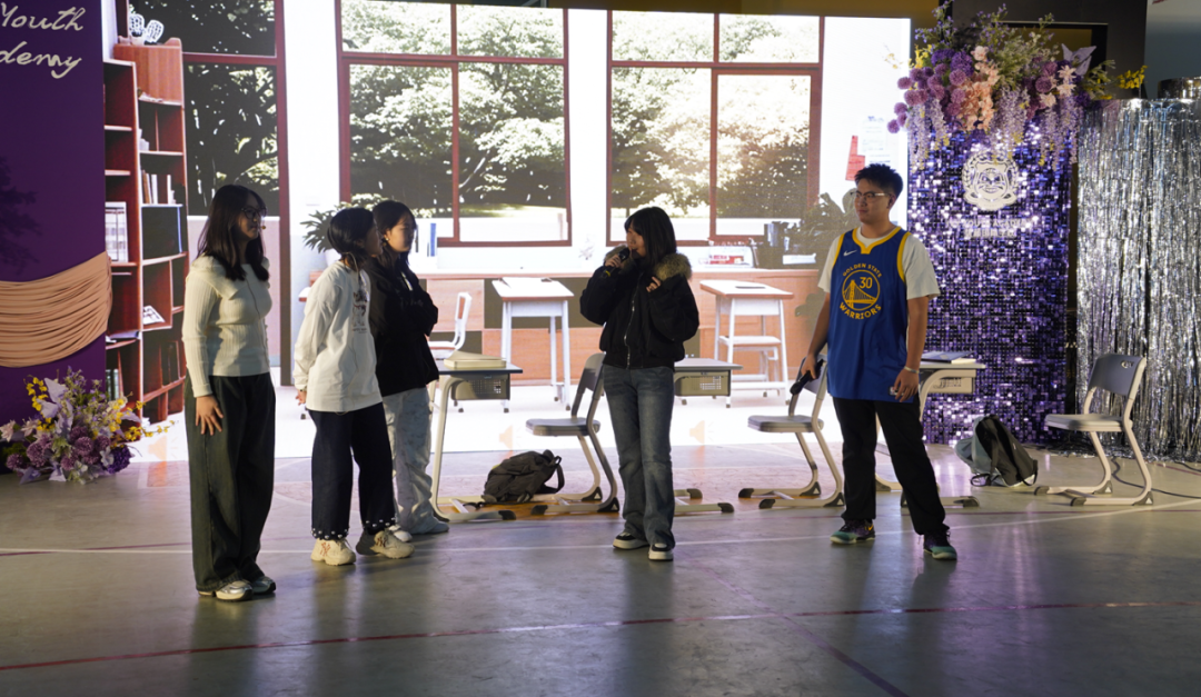Bill同学在遇到困难时也会主动思考解决方案,“女生在化妆时男生没法进去催场,所以我们寻求了Amy老师的帮助,Amy老师帮助我们负责女生,我们负责男生。”