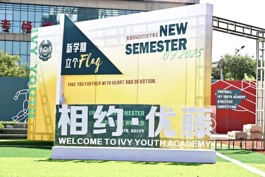 旗帜在微风中飘扬,每一字都承载着师生对新学期的憧憬与对世界的向往,像郑重的承诺,宣告优藤人将以行动“展开新学期,解锁全世界”。