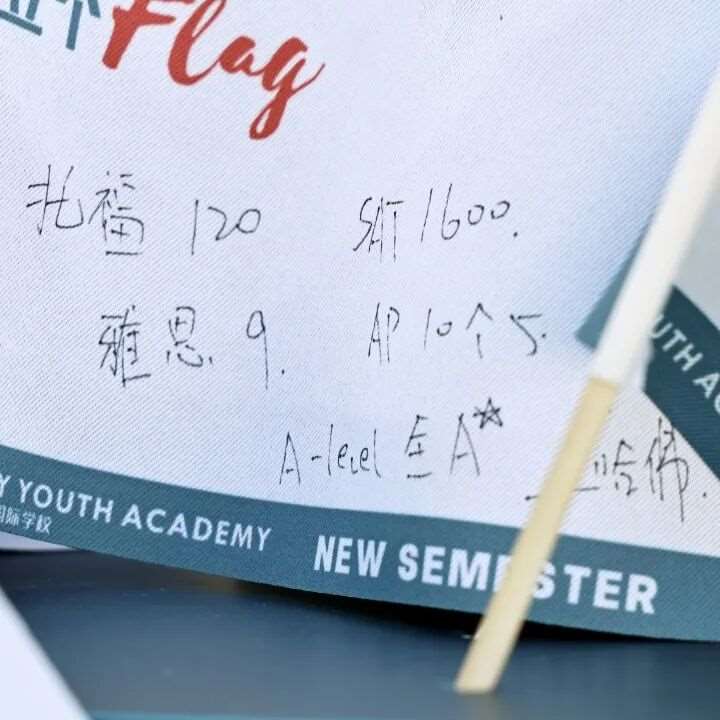 老生有的旗帜写着“本学期新目标:A-level全A*!”;有的是则是写下激励话语“前行必有曙光!”;新生的大多写着“认真学习外语,开心参与活动”。