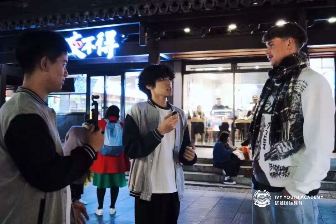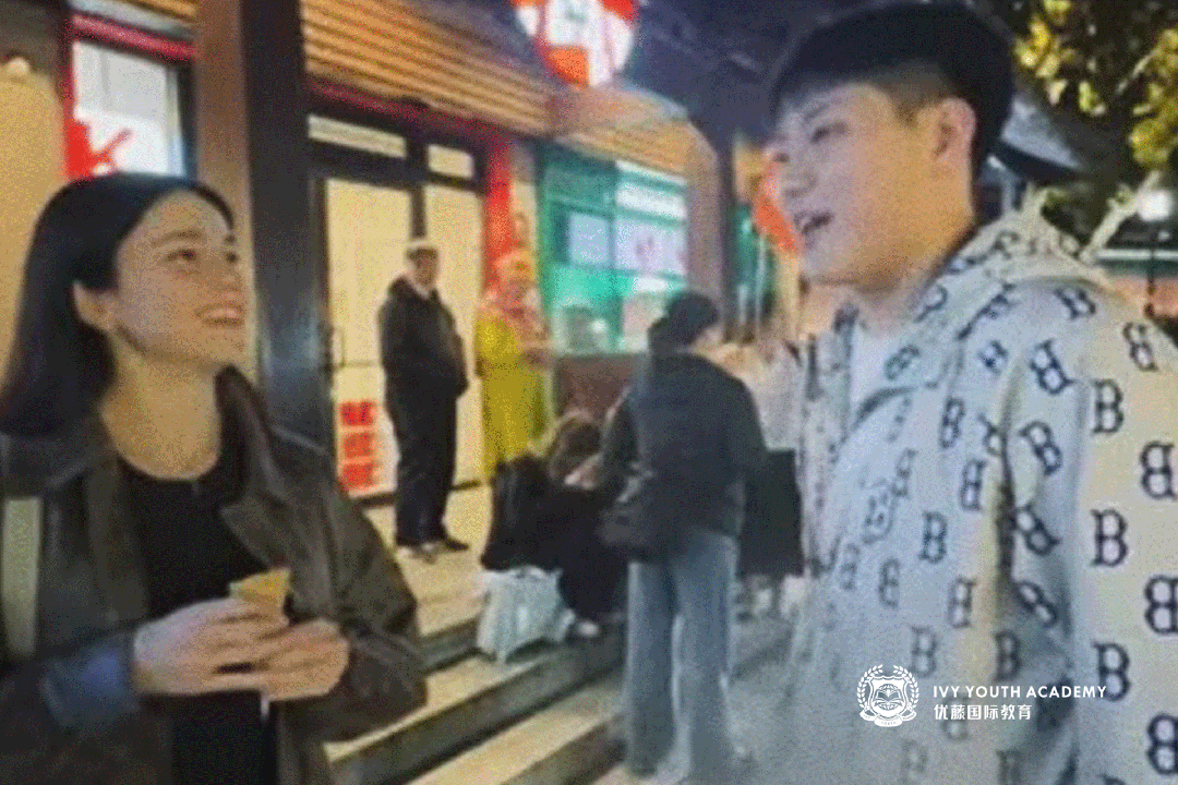 优藤的其他同学们也纷纷迈出勇敢一步,主动走向外国友人开启交流与采访。没有预设的完美脚本,他们带着好奇与真诚,用英语大胆提问、认真倾听,从旅行体验聊到文化差异,从兴趣爱好谈到生活感悟。过程中或许有青涩的停顿,但更多的是越说越自信的表达;即便遇到沟通卡点,也会用手势、眼神默契配合,在真实互动中打破语言壁垒。这场街头采访,不仅让同学们练活了口语,更收获了跨文化交流的勇气与乐趣。